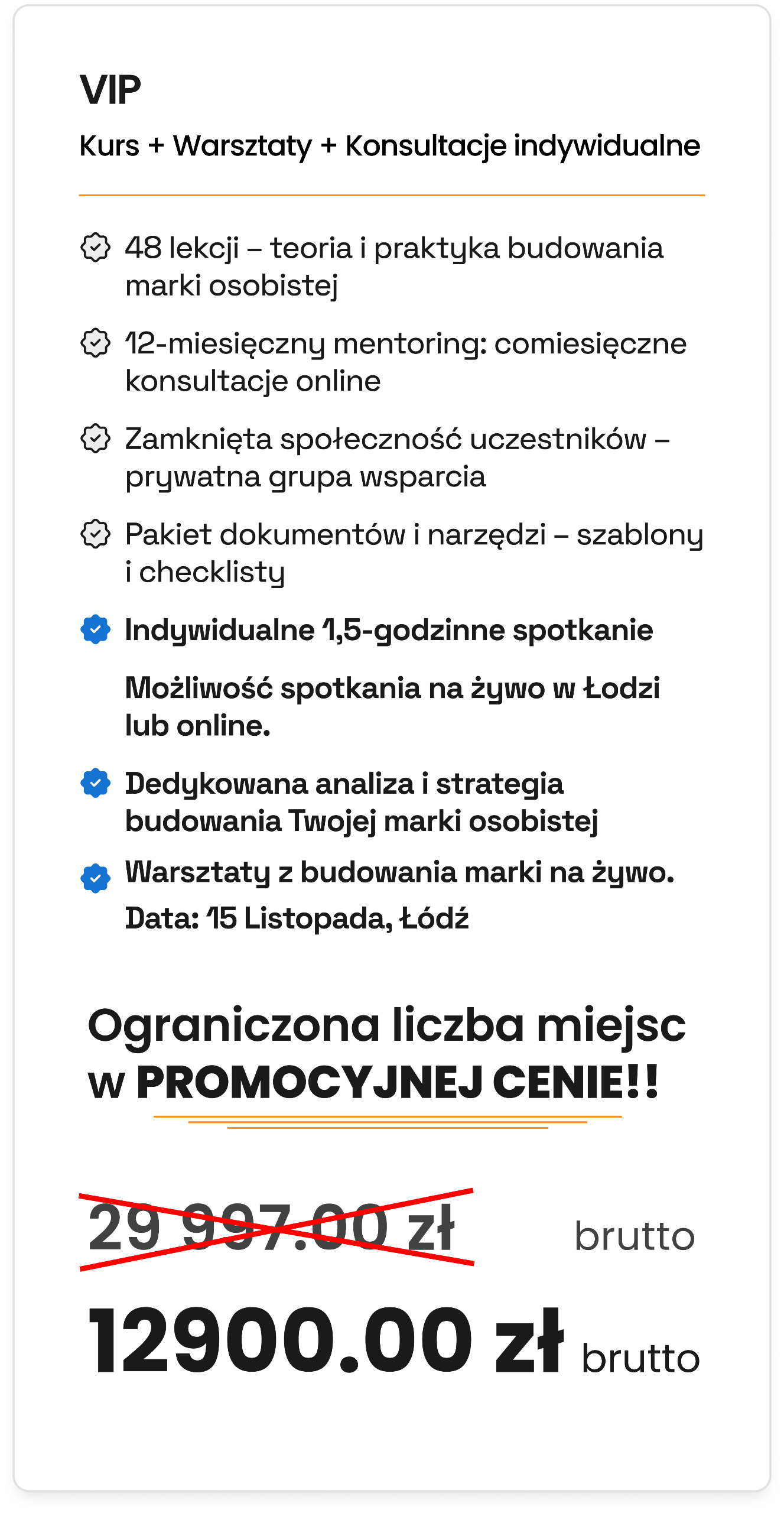 Raz w miesiącu spotkamy się na godzinnych konsultacjach grupowych online, gdzie przeanalizujemy Twoje postępy, odpowiem na pytania i omówimy konkretne strategie rozwijania marki osobistej.