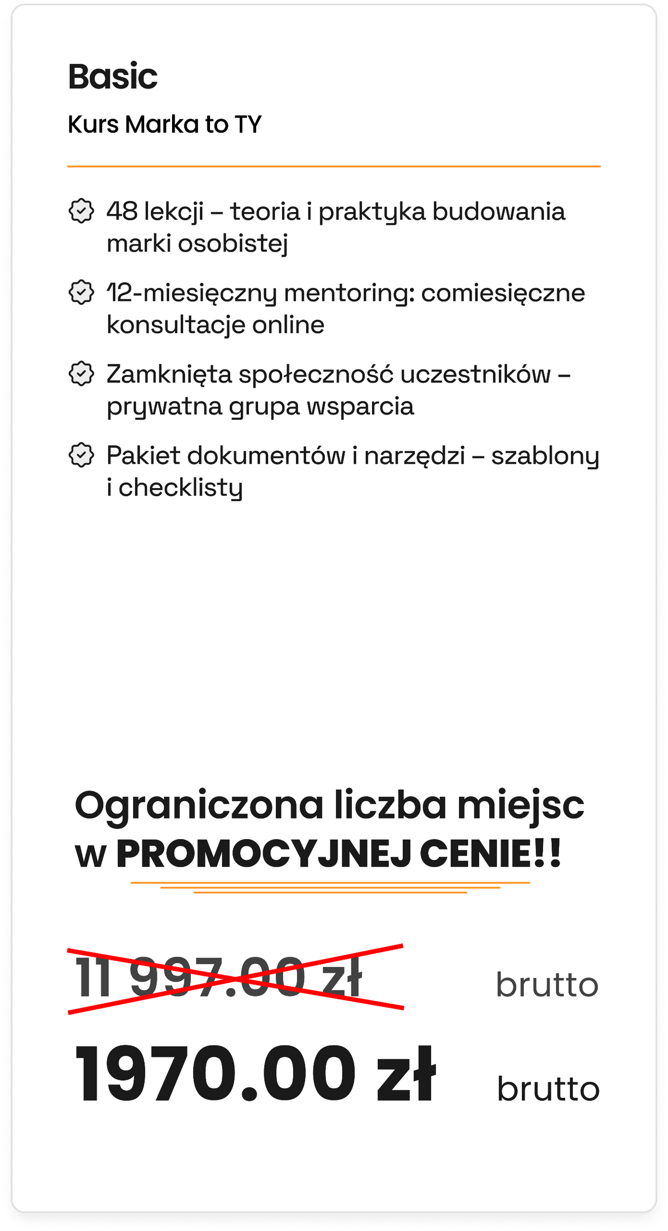 Od lat konsekwentnie rozwijam swoją markę osobistą, która pozwoliła mi zdobywać klientów, budować wiarygodność i realizować projekty, które dają mi największą satysfakcję.Z czasem odkryłem, że ogromną przyjemność sprawia mi dzielenie się wiedzą i wspieranie innych w rozwoju. Dlatego stworzyłem program „Marka to TY”, który pomaga unikać najczęstszych błędów i szybciej osiągać widoczne efekty w budowaniu marki. To nie jest tylko teoria – to praktyczny program oparty na realnych doświadczeniach i sprawdzonych metodach.Przez ostatnie 15 lat miałem okazję współpracować i dzielić się wiedzą z tysiącami osób – zarówno w Polsce, jak i za granicą – podczas warsztatów, szkoleń i wydarzeń na żywo. Wiem, jak ogromną różnicę robi praca we wspólnocie i możliwość czerpania inspiracji od innych. Widziałem to setki razy na własne oczy – i właśnie to chcę Ci zaoferować w tym programie.