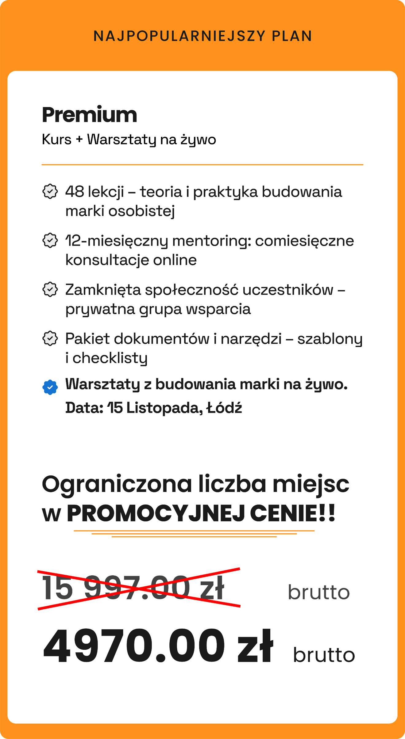 48 wykładów tematycznych – nowa wiedza dodawana systematycznie przez rok, obejmująca wszystkie kluczowe aspekty budowania marki osobistej.